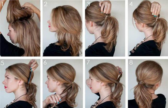 - Замаскируйте валик, опустив на него хвост. Равномерно расправьте волосы, чтобы они хорошо скрыли ваш тайный аксессуар.