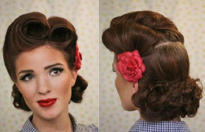 Прическа стала популярна в конце 40-х годов. История ее появления связана с послевоенным периодом, ведь и название переводится как «Трубы победы». Женщины сворачивали волосы в «трубы», контур которых складывался в букву «V». Чтобы сделать прическу в стиле стиляг как у девушки с картинки, воспользуйтесь такой инструкцией: