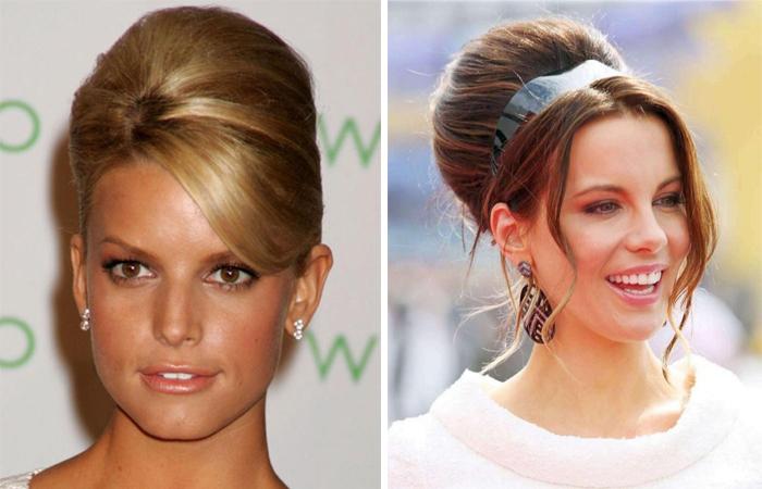 Джессика Симпсон дополнила «Бабетту» элегантно уложенной челкой, а Кейт Бекинсейл выпустила боковые прядки.