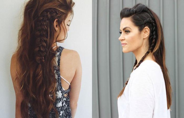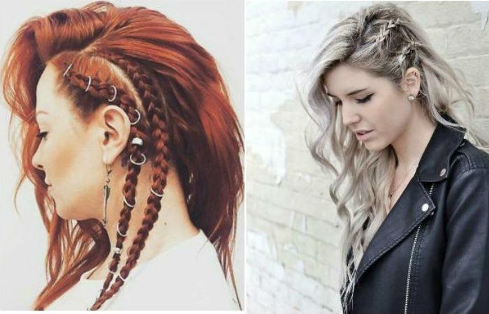 Две французские косички могут располагаться в асимметричных прическах. Креативная укладка роскошно смотрится на вьющихся прядях. Создается интересный неформальный образ, дополнить можно пирсингом для волос. Прическа походит разным типажам внешности, с помощью объемной части можно скрыть диспропорции, внешние недостатки.