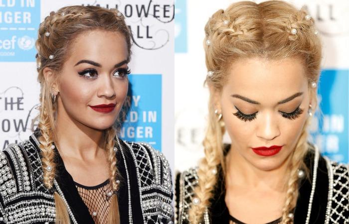 На одной из церемоний Рита Ора появилась с двумя колосками, декорированных жемчугом.