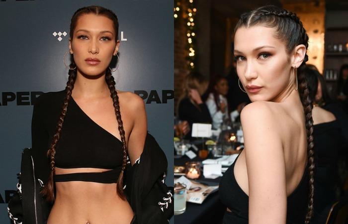Белла Хадид подчеркнула точеные параметры с помощью гладких, длинных кос. Прическа акцентирует внимание на совершенных чертах лица модели.
