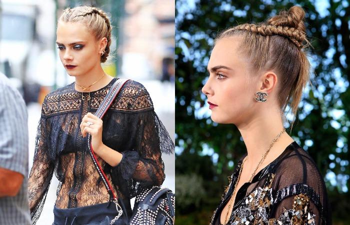 Кара Делевинь предпочитает оригинальные прически, используя французское плетение для стильных образов.
