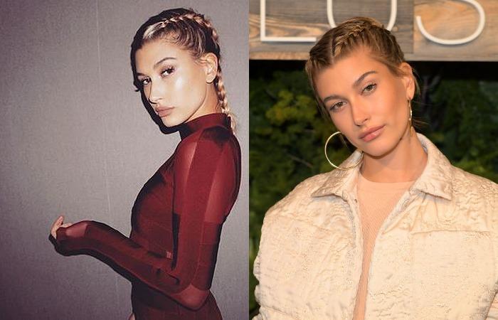 Хейли Болдуин использует сочетание нюдового макияжа и косичек на средние волосы.