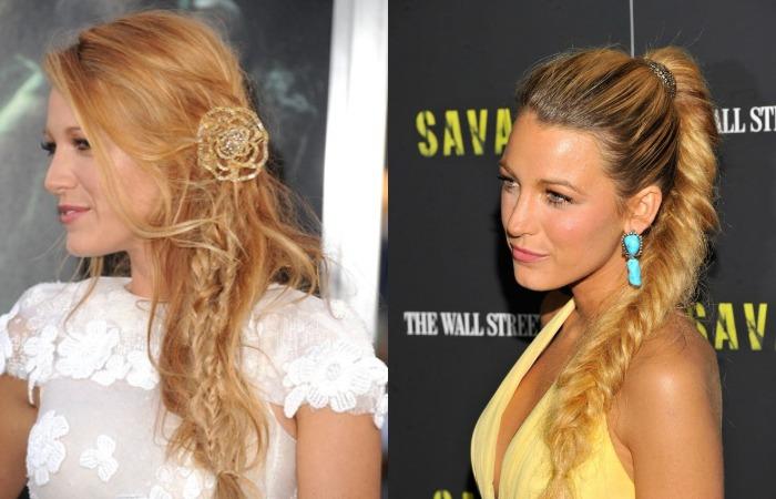 Блейк Лавли частенько использует оригинальные модели. Не обошла внимание и сложную косу из четырех прядок.