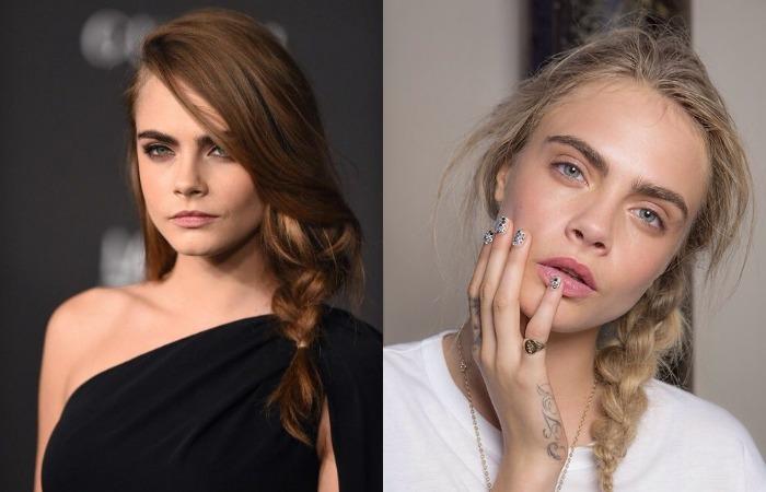 Кара Делевинь часто меняет цвет волос. Успешная модель использует сложные косы для создания стильных укладок.