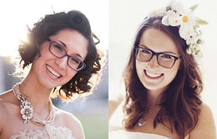 Очки станут стильным свадебным аксессуаром, сочетаются с распущенными завитыми локонами. Лучше отказаться от помпезных укладок и образа принцессы. Обязательно продумать дополнительный декор в виде крупных украшений, шляпки или ободка.