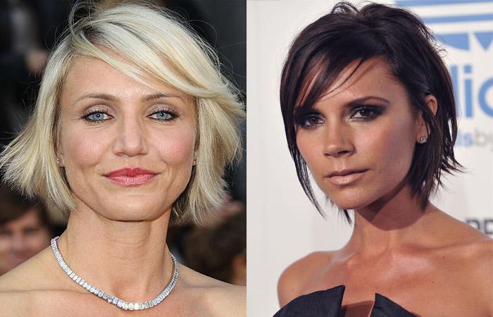 Каре с косой челкой обладает повышенной популярностью у звезд. Известные дивы ценят прическу за универсальность и свежий вид. Камерон Диас выбрала градуированный вариант до плеч, Виктория Бекхэм, Лера Кудрявцева — объемный формат боб, Пэрис Хилтон, Рианна носили асимметрию.