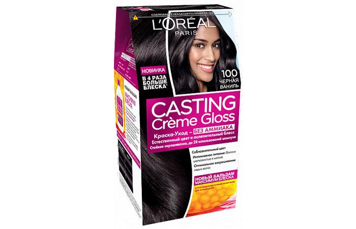 - Loreal Casting Crème Gloss (100 Черная ваниль). Не содержит аммиак и перекись водорода, поэтому не повреждает структуру волос. В основе краски находятся химические вещества, которые мягко воздействуют на локоны, не повреждая их структуру. Темный оттенок получается насыщенным, естественным. После смешивания красителя с проявителем получается смесь кремовой консистенции, которая легко наносится на пряди. Поскольку в составе краски нет аммиака, она вымывается раньше, чем большинство других стойких средств. Подробно о красках Loreal, палитры их оттенков вы найдете у нас на сайте.