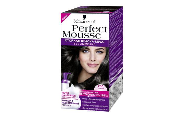 - Schwarzkopf Perfect Mousse(200 Черный). Черный оттенок заслужил массу хвалебных отзывов. Эта линия красок также не содержит аммиак и перекись, поэтому после окрашивания структура прядей не повреждается. Краска Perfect Mousse легко наносится, не требует кистей, емкостей. Краситель с проявителем смешиваются в тюбике от производителя, затем на него одевается специальная помпа, которая преобразовывает краску в воздушный мусс. Это позволяет легко распределить состав на волосах и не пролить его мимо головы. Краска практически не окрашивает кожу, легко смывается.