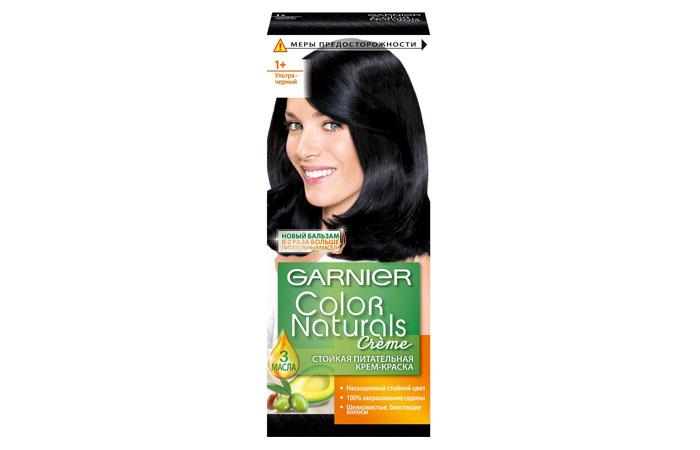 - Garnier Color Naturals(1+ Ультрачерный). Универсальная формула этой линии обеспечивает насыщенный, стойкий оттенок. Ухаживающие масла, содержащиеся в составе краски, смягчают действие красителей. После покраски волосы приобретают мягкость, шелковистость. Благодаря кремообразной текстуре, смесь легко распределяется по всей длине прядей. Узнайте больше о красках для волос Garnier (Гарньер) на нашем сайте.