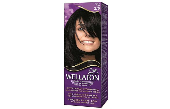 - Wella Wellaton (2\0 Черный). Черная краска от Wella содержит специальные компоненты, поглощающие УФ-лучи. В состав также вводят масла, сыворотки, стимулирующие рост волос и обеспечивающие стойкость цвета. Краска отлично закрашивает седину, удобна в нанесении.