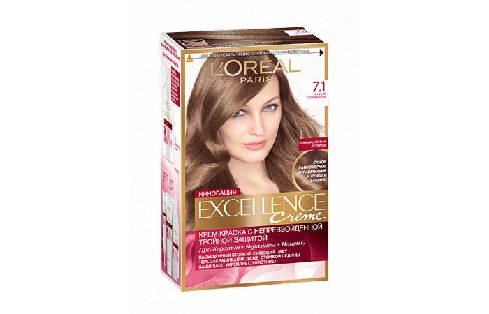 - L’Oreal. Краска Лореаль представлена различными сериями. К примеру, Excellence предлагает оттенок 7.1 «Русый пепельный», а CASTING Creme Gloss 801 и 810 «Светло-русый пепельный» и «Светло-русый перламутровый». В арсенале у производителя также значатся оттенки Recital 8.1, 9,1 и 10.21 под названием «Копенгаген», «Викинг» и «Стокгольм». Но к сожалению, по мнению пользователей, хотя эта краска и является щадящей, через неделю-другую она практически полностью смывается.