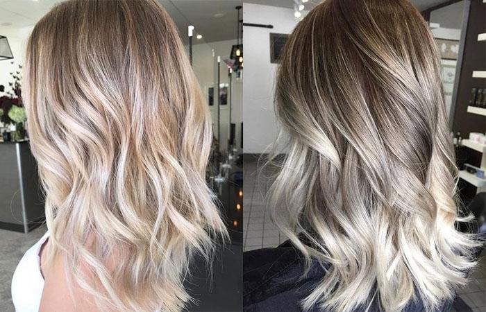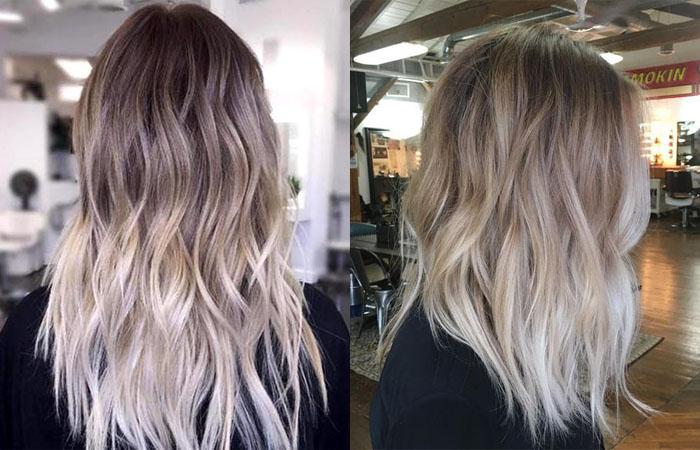 Предполагает растяжку цвета от корней к кончикам, при этом используется несколько полутонов. Особенно гармонично подобное окрашивание смотрится на завитых локонах. Как правило, используют пепельный блонд, а корни оставляют нетронутыми.