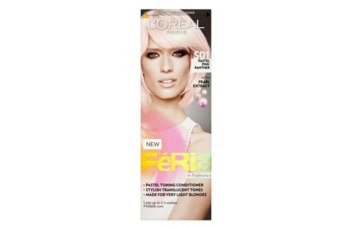 - L’OREAL. Косметика предлагает красоткам жемчужный блонд, сандал с персиковым отливом, манго, розововато-лиловый, деним и фиолетовый дым. Новинкой является оттенок «Розовая пантера: пастельный» под номером S01.