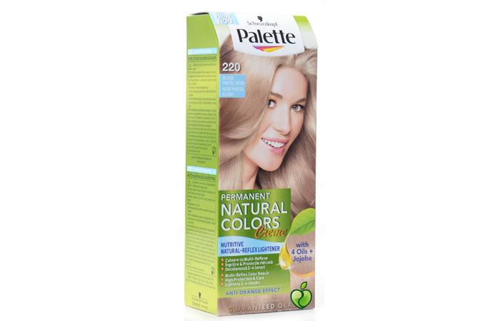 - Palette. Как утверждает производитель, пигмент его красителей смывается только на 24–28 раз. Краска Палетт Фитолиния 220 «Жемчужный блонд» обеспечит шевелюре бледный розовый оттенок.
