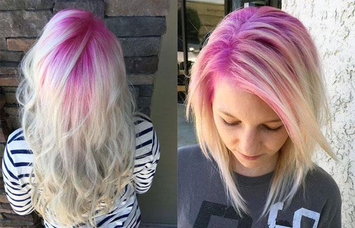 Очень необычная, но хитовая покраска. Корни красят в розовый, а все остальные волосы в блонд. Получается неординарно и довольно смело. Розовые вкрапления придают вашему луку драматичность и экстравагантность. Окрашивание совершается в технике омбре.