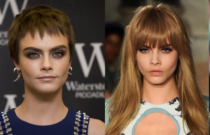 Кара Делевинь сочетает ступенчатую модель с роскошными, ниспадающими локонами и ультракороткой стрижкой.