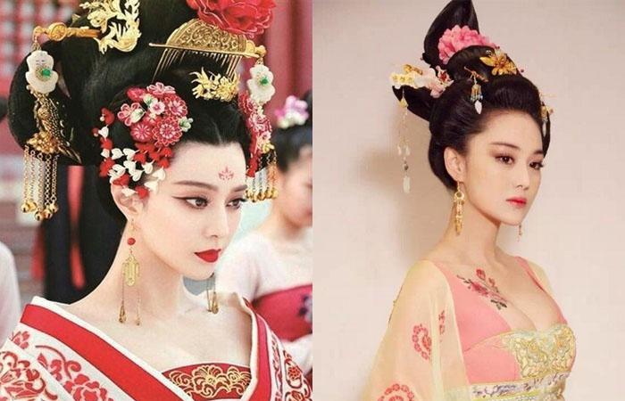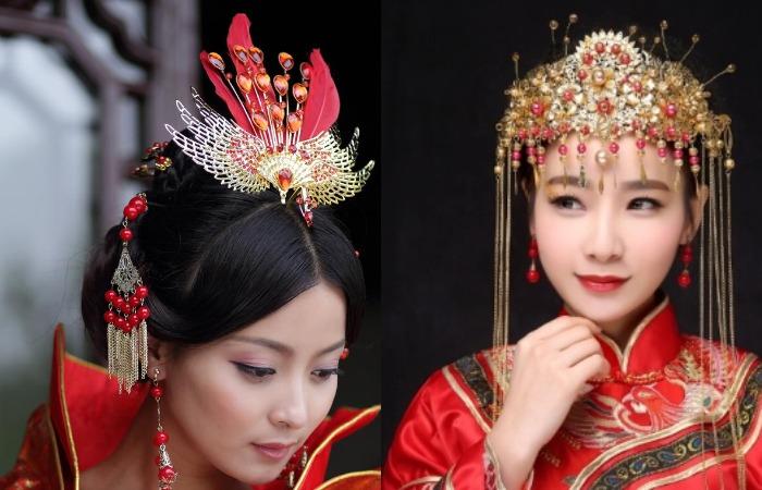 Прически китайских принцесс отличаются особой сложностью конструкции. Нередко для создания подобного шедевра использовались парики. Укладка состоит из множества элементов, включающих пучки, косы, аккуратно уложенные завитки. Представляет собой настоящую каркасную конструкцию, объем распределяется в области темени, макушки, у висков. Особое внимание уделяется украшениям прически. Вместо короны, используются цветы, листья, перья павлинов, изготовленные из золота. Объемная модель подчеркивает нежность и хрупкость молодых девушек, создает красивую линию овала.