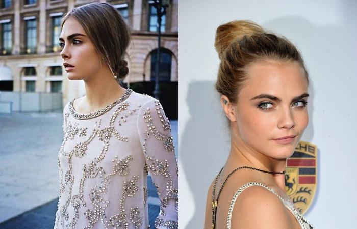 Кара Делевинь часто собирает волосы в гладкие пучки.