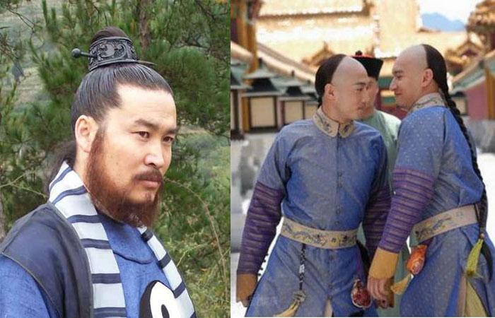 Мужчины также носили пучки, которые располагались на макушке или темени, волосы тщательно приглаживались для создания безупречных причесок. Китайские монахи сбривали шевелюру, чтобы не отвлекаться на уход и укладку. В период завоевания империи, мужской части населения теменную область брили налысо, оставляя лишь тонкую косу в области затылка.