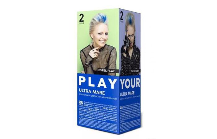 Краска для волос Estel Play в синем цвете представлена оттенком Ultra mare, помогает добиться насыщенного яркого тона. В набор входит также пудра для осветления и 6% окислитель позволяющего создать модный, яркий образ даже обладательницам темных локонов. Подходит для частичного окрашивания, стойкость цвета обеспечена до 4 недель. Краску Эстель можно купить за 150 руб.