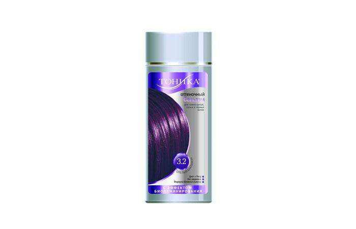 Оттеночный бальзам для волос Тоника синий цвет представлен оттенками: дикая слива, аметист и перламутр. Нанести средство на чистые влажные локоны, для придания легкого тона развести с водой. Оставить на 3–5 минут, для получения насыщенного цвета выдержать все полчаса. После смыть под проточной водой. Подходит для окрашивания седых волос, держится оттенок от 3 до 7 процедур мытья с шампунем. Содержит экстракт льна, обеспечивающего глянцевое сияние. Стоимость 154 руб.