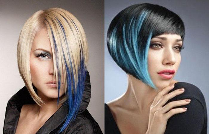 - выделение отдельных широких прядей часто используется на авангардных стрижках, колорирование может включать несколько оттенков из палитры синего, создаются красивые плавные переходы, подчеркивающие динамичность укладки.