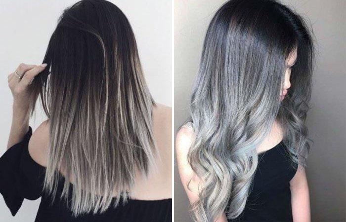 - Омбре — цвет прикорневой области резко отличается от кончиков, переход плавный, градиентный. Не проводится в домашних условиях, лучше смотрится на длинных прямых локонах. Седой может использоваться как основной цвет с клубничными, лавандовыми или бирюзовыми срезами. В классическом окрашивании удачными станут сочетания пепельного и темно-русого, иссиня-черного и перламутрового.