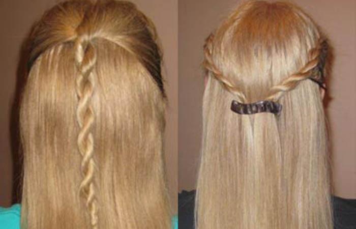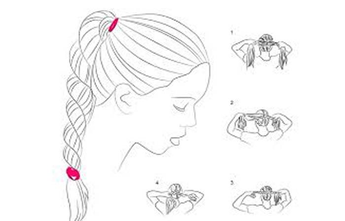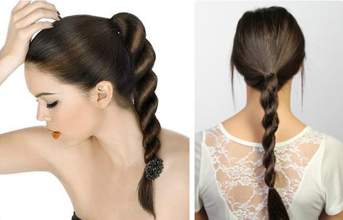 - Хвост делят на равные половинки. Полученные пряди равномерно закручивают в одну сторону. Рекомендуется одновременно захватить пальцами разных рук части хвоста, скручивать волосы в едином направлении.