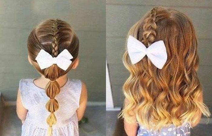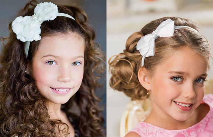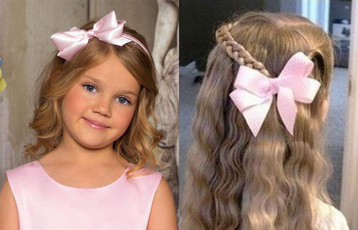 Нарядным станет и ободок, украшенный большим бантом, распущенные локоны. Красиво смотрятся как с челкой, так и без нее. Детское личико совершенно, и не нуждается в применении парикмахерских хитростей.