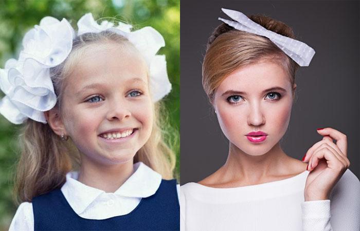 Белые, цветные банты могут быть в виде шляпок, резинок, ободков, заколок, а также созданные из собственных волос.