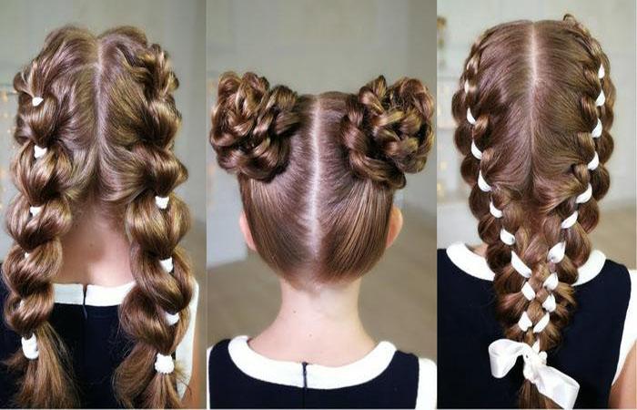 Помимо стандартных хвостиков, можно заплести жгуты или косы. Укладка позволит справиться с непослушными кудрями, длинными локонами.