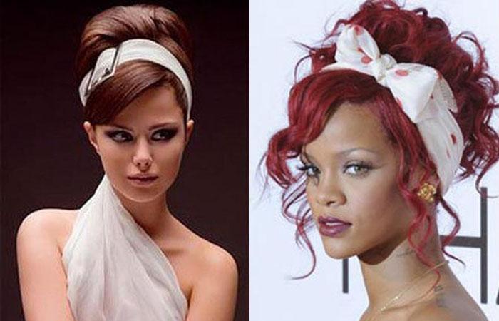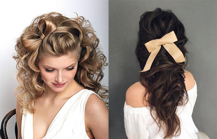 - Выбор прически зависит от длины, типа волос, можно сочетать с распущенными локонами, частично собранными или заплетенными в косы, пучки, хвосты.