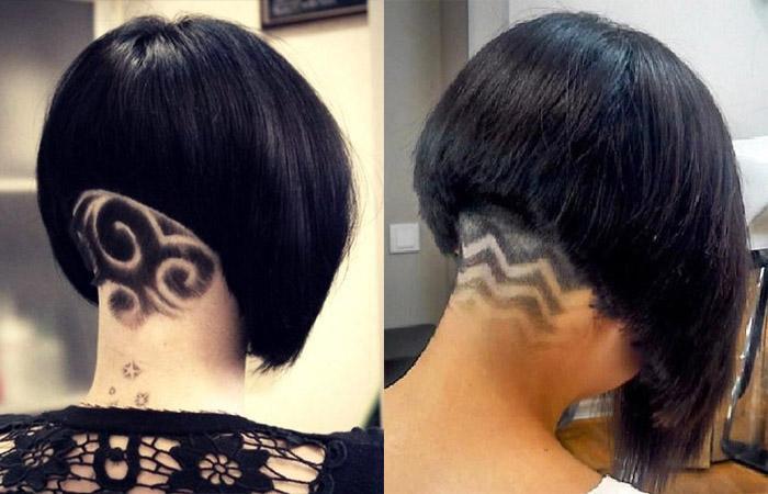 Ультрамодно и необычно смотрится узор на затылке. Для деловой встречи креативный элемент можно прикрыть удлиненными верхними прядками, а для праздничной вечеринки, наоборот, продемонстрировать всю силу и яркость образа с помощью соответствующей укладки.