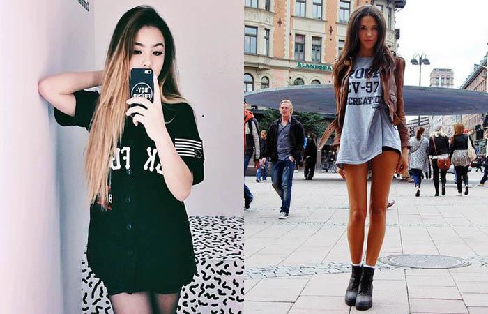 Одежда в стиле «тумблер» своеобразная и комфортная. Короткие шорты с высокой посадкой, свободная джинсовая рубашка и длинная футболка с принтом, удобные штаны и широкий «бабушкин» свитер — неизменные атрибуты в одежде девушки-тумблер.