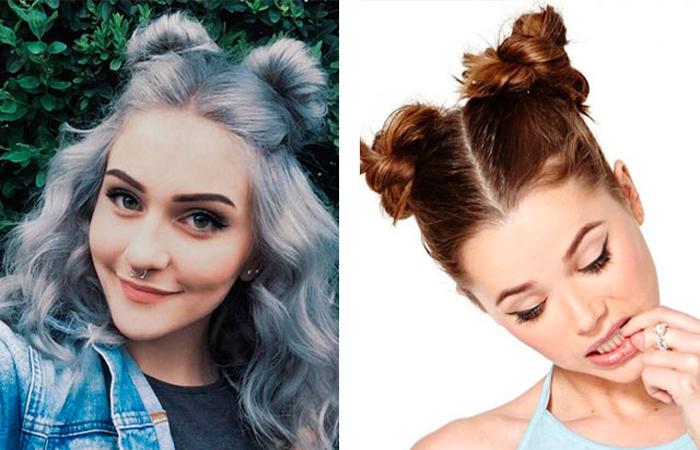 Симметричные высокие пучки — визитная карточка для тумблер-герл. Они просты в выполнении и смотрятся ярко. Ничего страшного, если короткие пряди на затылке не соберутся в пучок, а останутся ниспадать вниз.