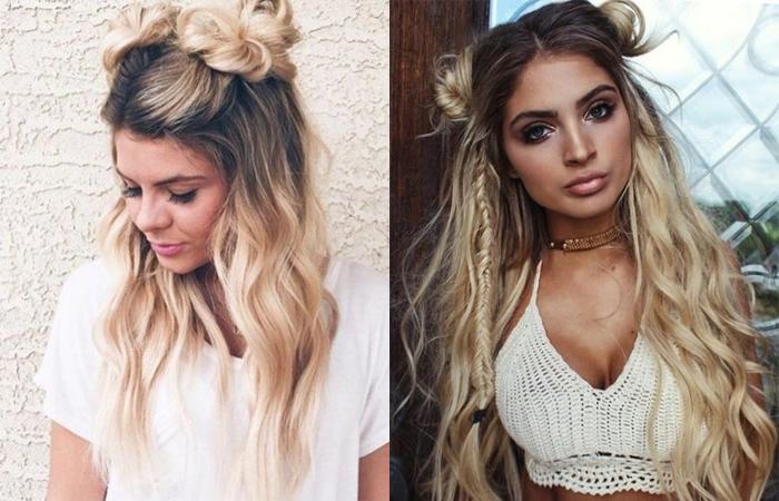 Бесподобно смотрятся два пучка, выполненные по такому же принципу (когда большая часть волос распущена). Особенно если выполнено окрашивание в технике омбре.