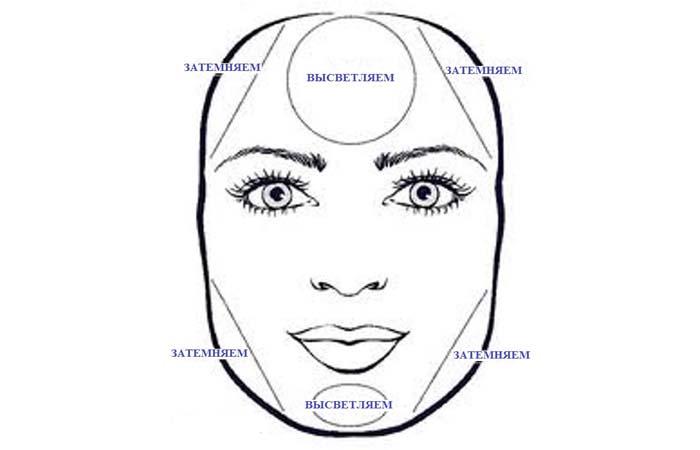 Поверх естественного тона рисуют темные полоски в углах лба около линии роста волос, от мочки ушей до уголков губ, по бокам носа, по линии подбородка. Светлый хайлайтер наносят на межбровный треугольник, на щеки под глазами, на спинку носа. Разноцветные линии тщательно растушевывают.