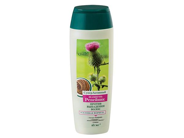 СуперАктивный шампунь «Репейник» против выпадения волос от белорусской косметической компании Витекс — проверенный и безопасный способ улучшить состояние шевелюры, остановить обильное выпадение волос и усилить их рост. Усиленная формула средства включает экстракт репейника, кофеин, D-пантенол, а также запатентованный комплекс протеинов Dynagen ТМ. В составе репейного продукта также присутствует система кондиционеров, которые облегчают расчесывание волос после мытья, и внушительный перечень химических компонентов.