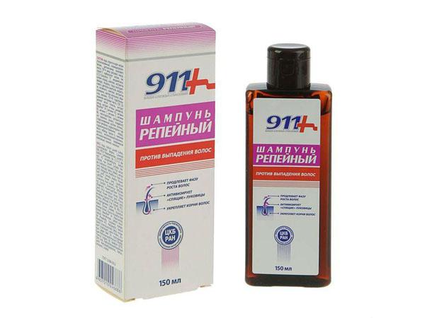 Шампунь 911 «Репейный» производится российской компанией ТВИНС Тэк. Производитель убеждает в высокой эффективности средства для решения проблемы с выпадением. Богатейший на витамины и растительные экстракты состав обещает восстановить ломкие и ослабленные волосы, активизировать фазу роста, пробудить спящие фолликулы, вернуть блеск и здоровье шевелюре. Помимо репейного масла, в формуле продукта присутствуют витамины С, Е, В3, В5, В6, экстракты люцерны, авокадо, абрикоса, цветов апельсина и розмарина.