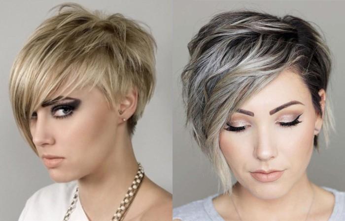 Асимметричные прически на короткую длину добавляют игривые, дерзкие нотки образу. Четко прослеживается несколько ярусов, пышная макушка постепенно переходит в удлиненную часть. Затылок и один из висков открыты, прическа акцентирует внимание на узком подбородке, красивой линии шеи. Подходит женщинам разных возрастных групп и рода деятельности.