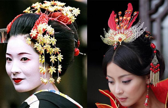 На средние волосы больше вариантов красивого оформления шевелюры на восточный манер. Подражая китаянкам или японкам, создают гладкий пучок на затылке. Рекомендуется сделать конструкцию объемной с помощью валика. Результат украшают гребнем из кости или металла, дополненным камнями. Хотя подойдет и дешевая пластиковая имитация.