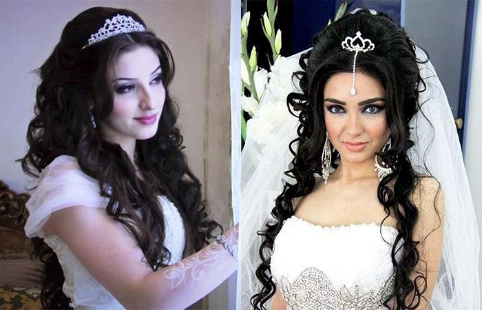 Обладание длинными волосами дает простор для фантазии. Чаще женщины предпочитают варианты на арабский манер. Шевелюру завивают, приподнимают. Делают простую конструкцию в виде объемного хвоста или пучка. Допустимо выполнить сложную композицию из кос, жгутов, кудряшек. Результат обязательно дополняют бижутерией.