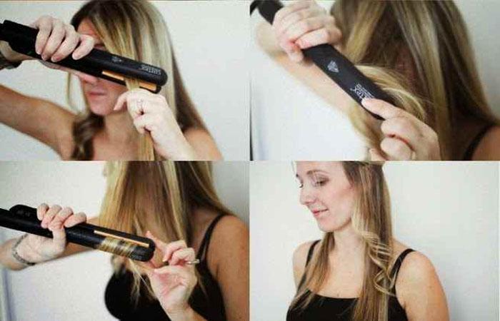 - Выделить тонкую прядь. Отступить от корней пару-тройку сантиметров, расположить утюжок на пряди.