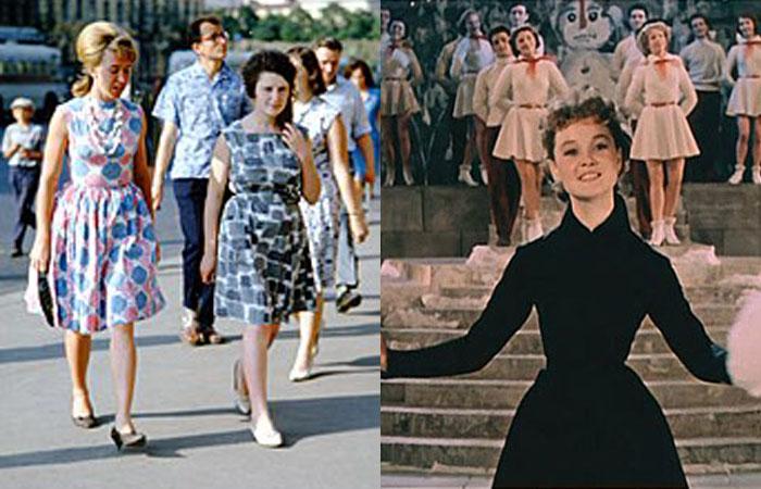 На фоне советских «скромниц» ярким пятном выглядят стиляги, черпающие моду Запада. Постепенно, не спеша модные тенденции доходят до СССР. Женщины украшают голову локонами в манере Мерлин Монро, крайне популярны пучки с начесом.