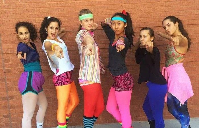 Яркую прическу дополняли не менее оригинальным нарядом. Цветные леггинсы, облегающие джинсы, блузы с откровенным декольте, мини-юбки, кожаная куртка или строгий пиджак присутствовали в гардеробе каждой американской модницы.