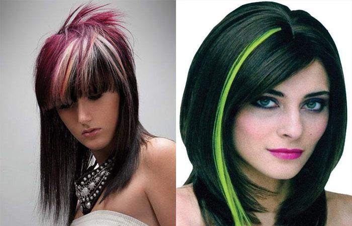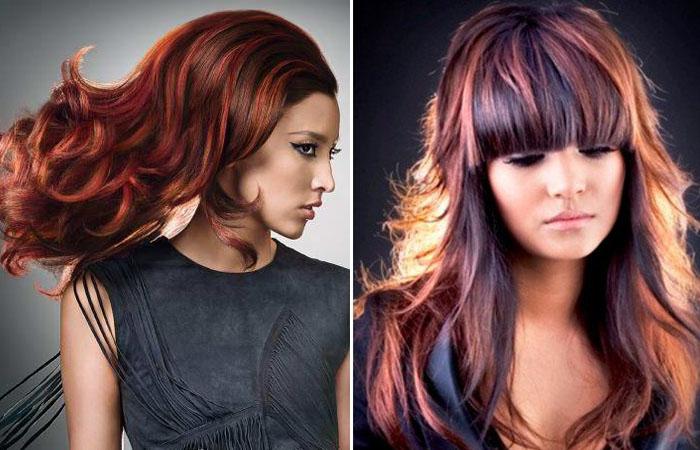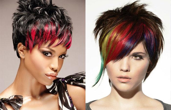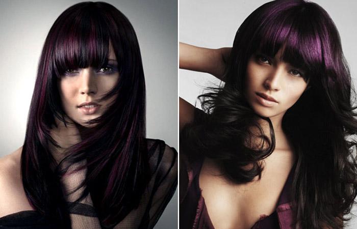 Контрастные пряди, яркая челка — оптимальный выбор для обладательниц ультрамодных стрижек боб и пикси. Лиловые, винные акценты выглядят смело и сногсшибательно.
