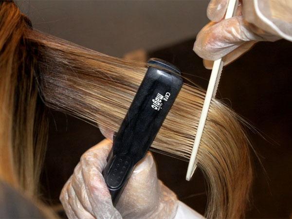 Затем происходит выпрямление утюжком. Технология позволяет пропитать кератином структуру волос и сгладить чешуйки. Пряди будут блестящими, гладкими и шелковистыми. Как правильно пользоваться утюжком, вы можете прочесть на нашем сайте.