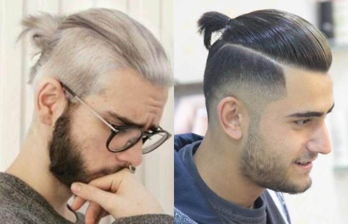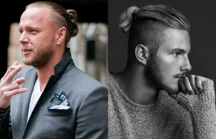Модный пучок на затылке позволяет выполнить укладку всего за несколько минут. Собранные пряди легко фиксируются резинкой, элегантный образ достоин торжественного вечера. Подходит стильным, уверенным, харизматичным мужчинам. Не имеет возрастных ограничений, сочетается с бородой, бакенбардами.